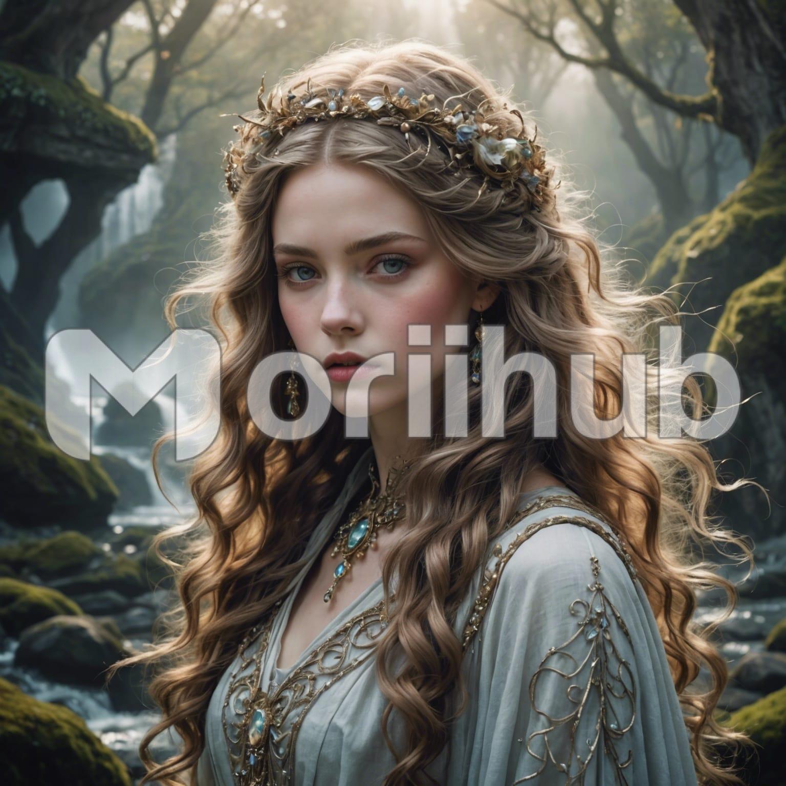 In the heart of the woods, a stunning fantasy woman stands, exuding an otherworldly grace. Floral arrangements entwine through her flowing hair, adding a touch of nature’s splendor to her ethereal beauty. Sparkling jewels adorn her, catching the light and casting delicate glimmers that enhance her mystical allure. Her presence harmonizes with the forest, where ancient trees and vibrant foliage create an enchanting backdrop. The interplay of florals and jewels against the natural setting evokes a sense of timeless enchantment, as if she is a guardian of the woodland realm.