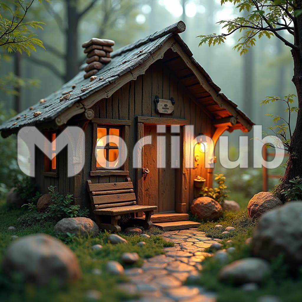 In the heart of a dense forest, a secluded cabin stands illuminated by the soft glow of warm, inviting lights. The cabin, made of rustic wood with a stone chimney, exudes a sense of coziness and charm. As evening falls, the golden light from within spills out through the windows, casting a gentle glow on the surrounding trees and the snowy ground. The light creates a stark contrast against the darkened forest, making the cabin appear like a beacon of warmth and comfort amidst the wilderness. Smoke curls lazily from the chimney, hinting at a roaring fire inside, where perhaps someone is curled up with a book or enjoying a hot drink. The scene is serene, evoking feelings of peace and solitude, with the cabin’s light offering a sense of security and welcome in the otherwise quiet and vast expanse of nature.