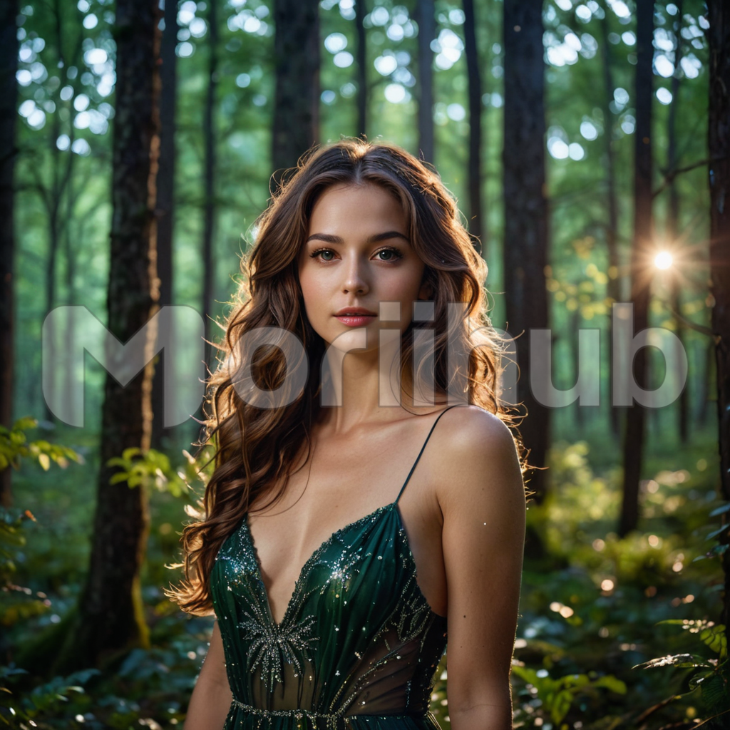 Amidst the tranquil embrace of the woods, a beautiful woman stands, her gaze fixed ahead with an air of quiet contemplation. Sunlight filters through the canopy, casting a gentle glow on her serene features. Surrounded by towering trees and verdant foliage, she exudes a sense of calm and grace, her presence harmonizing with the natural beauty around her. In this serene moment, she is a vision of tranquility and timeless elegance amidst the wilderness.