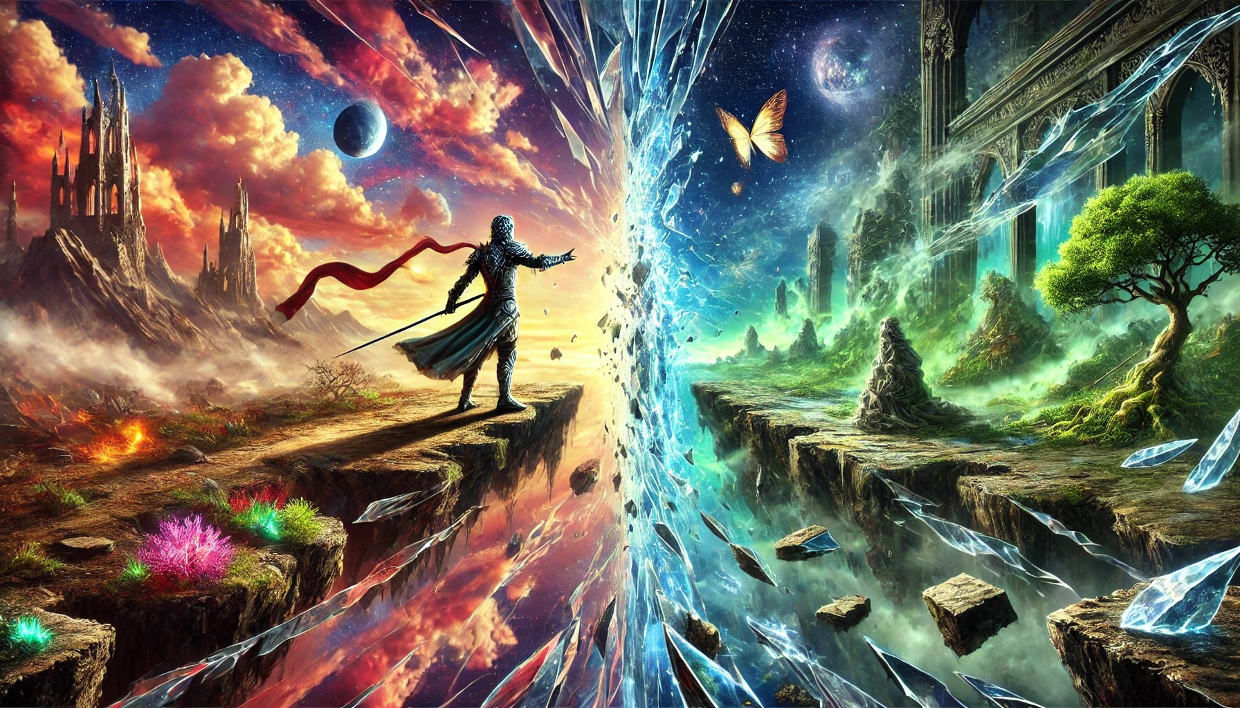 This illustration captures a surreal and mind-bending moment where the fabric of reality itself is unstable. A lone warrior stands at the boundary between two opposing worlds—one side a breathtaking dreamscape with floating islands, glowing flora, and vibrant skies, the other a crumbling wasteland of ruins, darkness, and decay.
