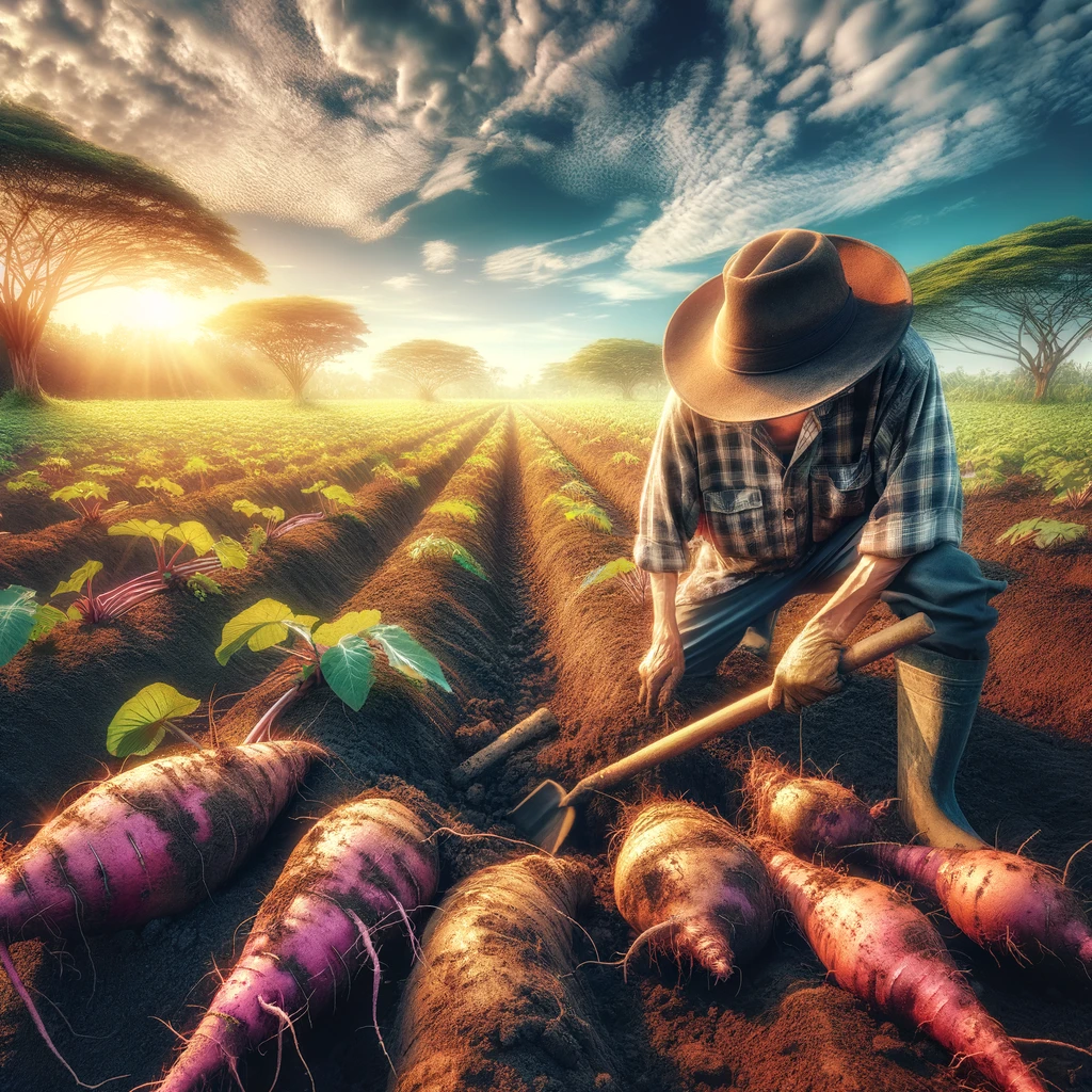 In the radiant embrace of a bright, sunny sky, a vivid tableau unfolds amidst the verdant expanse of a lush field. A farmer, adorned in durable work clothes and shielded by a wide-brimmed hat, stoically tends to the harvest of yams. With weathered hands, they gently unearth each tuber from the rich, fertile soil, their movements steeped in the rhythm of the land. The air is alive with the symphony of nature—birdsong mingling with the rustle of leaves—as the farmer’s diligent labor pays homage to the timeless dance of agriculture. Against this backdrop of abundance and vitality, the farmer’s connection to the earth is palpable, their toil a testament to the enduring bond between humanity and the natural world.